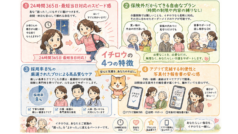 イチロウは、24時間365日、最短当日にプロの介護士を依頼できる「オーダーメイド訪問介護サービス」です。